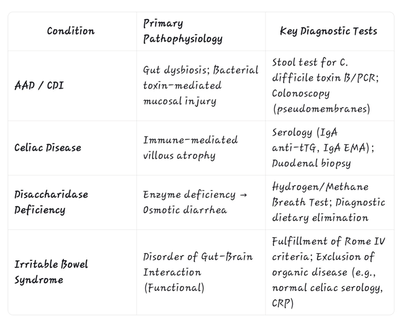 Chronic and recurrent gastrointestinal symptoms, such as diarrhea, abdominal pain, and bloating, are among the most common reasons for patient visits in primary care and gastroenterology settings (Ford et al., 2020). The differential diagnosis for this symptom complex is broad, encompassing conditions with vastly different etiologies, including infectious, immune-mediated, enzymatic, and functional disorders. Misdiagnosis can lead to ineffective treatments, unnecessary procedures, and patient distress. This article focuses on differentiating five key conditions: antibiotic-associated diarrhea (AAD), pseudomembranous colitis (caused by Clostridioides difficile), celiac disease, disaccharidase deficiencies, and irritable bowel syndrome (IBS). Distinguishing between these entities is paramount, as their management ranges from simple dietary adjustments and medication cessation to lifelong strict gluten-free diets or targeted pharmacotherapy (Lacy et al., 2021). The objective of this review is to provide a clear, evidence-based framework for clinicians to navigate this common diagnostic dilemma.